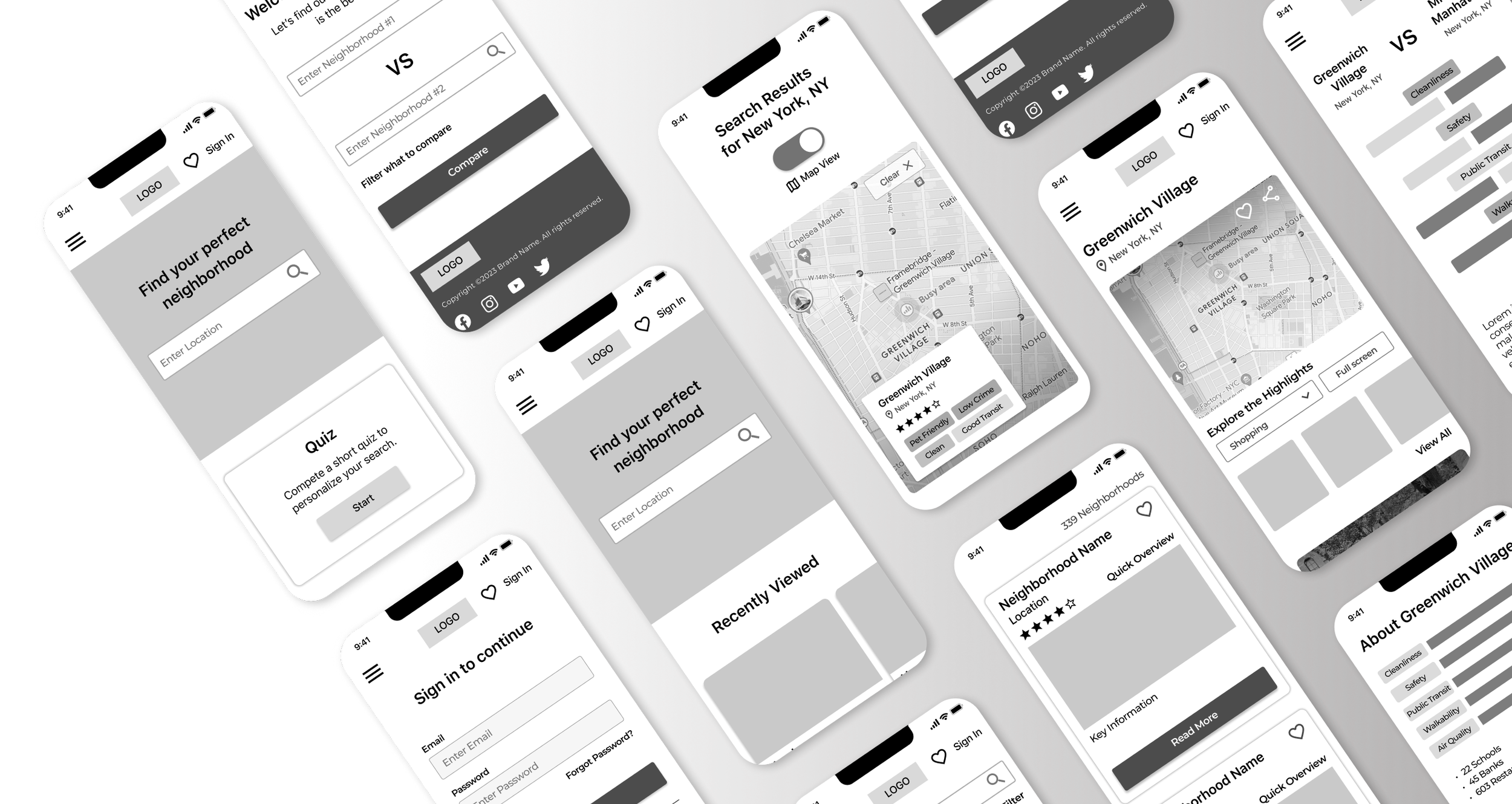 In order to have my website tested, I have created mobile high-fidelity wireframes alongside with the prototype of the following screens: sign in page, home page, quiz, search results page, sort & filter, neighborhood page, compare tool, and compare results page.